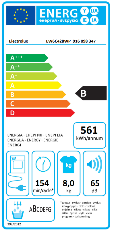 Shown below are two energy labels. The condenser model has a B energy rating and a drying time of 154 minutes.